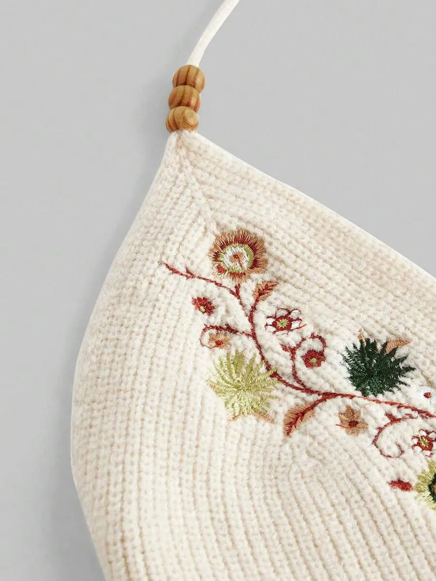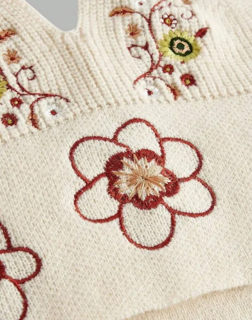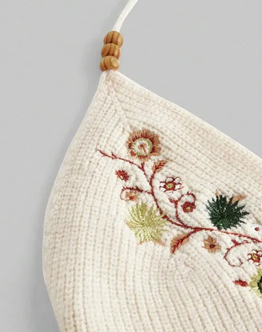 ND-06: تي شيرت كريمة متماسكة مع تطريز الأزهار ، ربو حبة خشبية. أبيض مطرز غطاء ، تصميم كامل الطول.